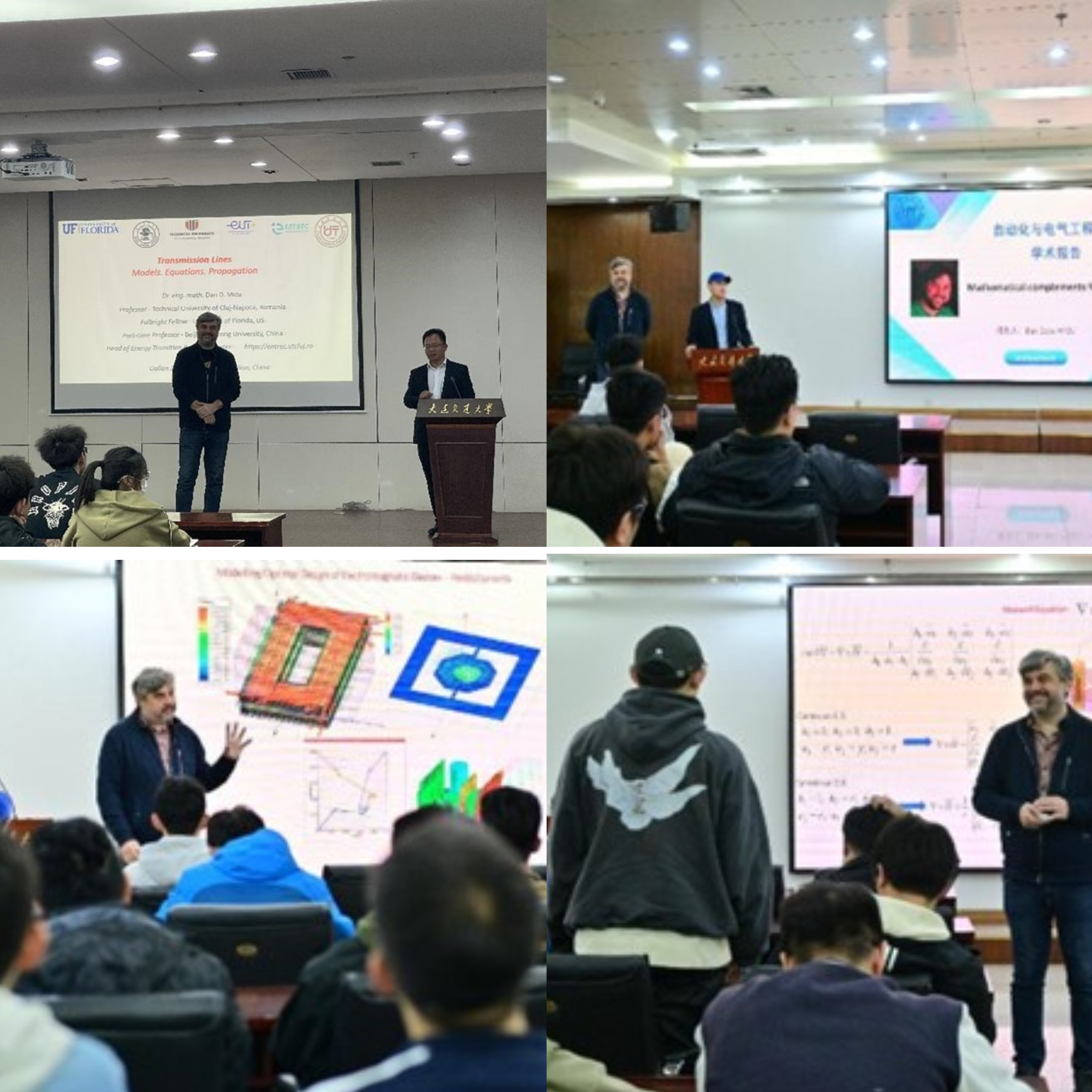 Doru MICU教授针对电磁场的工程应用,完成了微分算子变式推导(梯度、散度、居里、散度Stokes定理),结合电路场景和数学理论,为研究生们讲解了电磁场运算中的数学公式及各种方程的应用推导,介绍了电磁学技术在各个工程领域的应用及其前景。