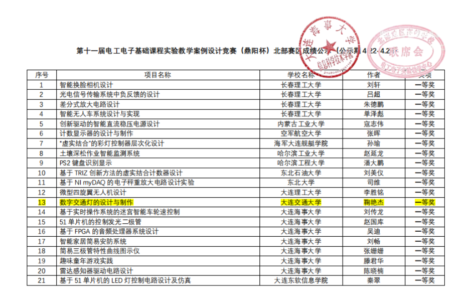 教师鞠艳杰在4月21日举办的第十一届电工电子基础课程实验教学案例设计竞赛(鼎阳杯)北部赛区竞赛中喜获一等奖,同时获得参加全国复赛资格。